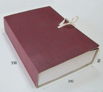 Короб изготавливается из переплетного картона толщиной 1,25 мм. Толщина корешка 80 (вместимость 700 листов) или 120 мм (вместимость 1000 листов). Внутри вклеен поддон из микрогофрокартона.