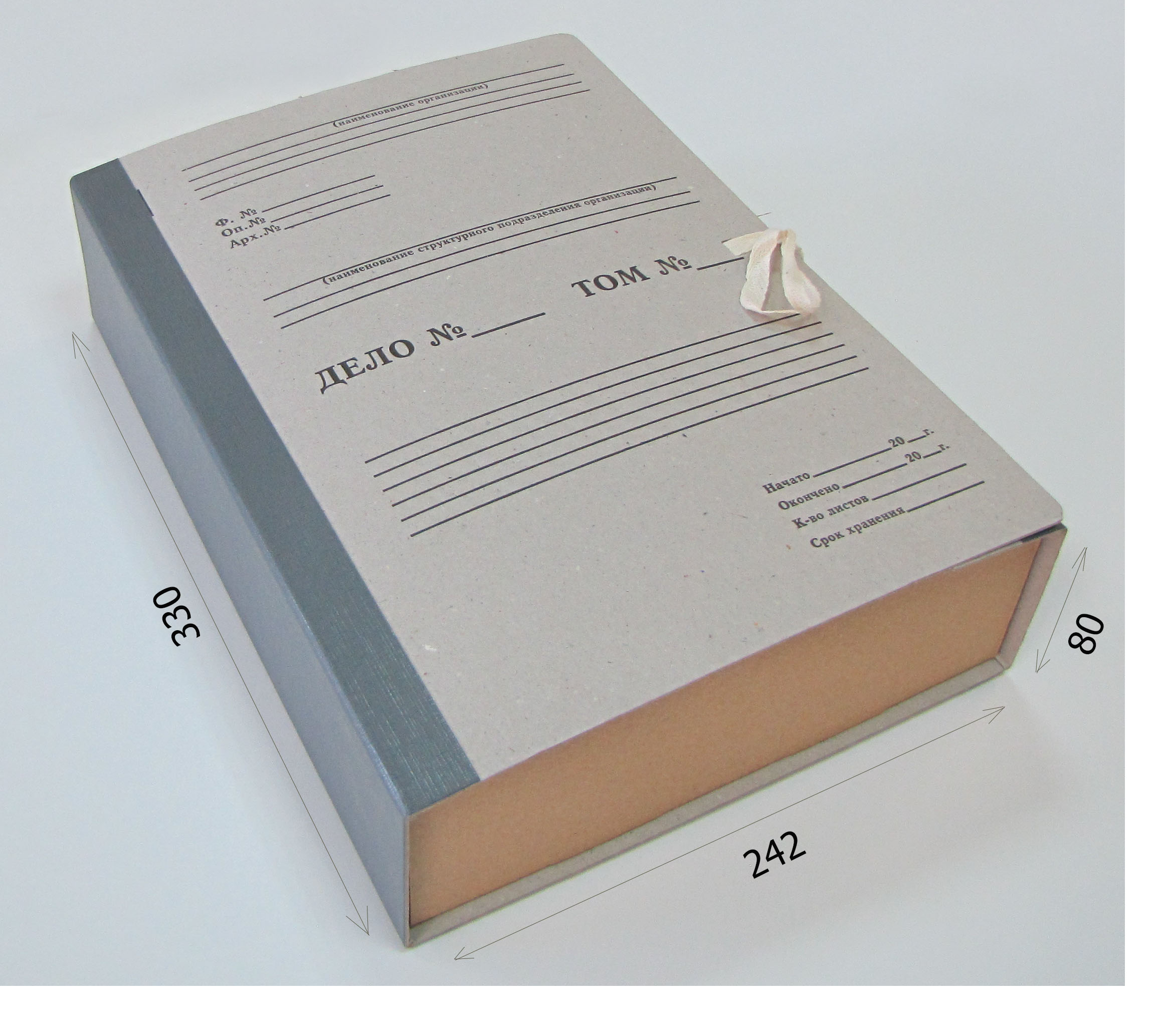 Короб изготавливается из переплетного картона толщиной 1,25 мм. Толщина корешка 80 (вместимость 700 листов) или 120 мм (вместимость 1000 листов). Внутри вклеен поддон из микрогофрокартона.