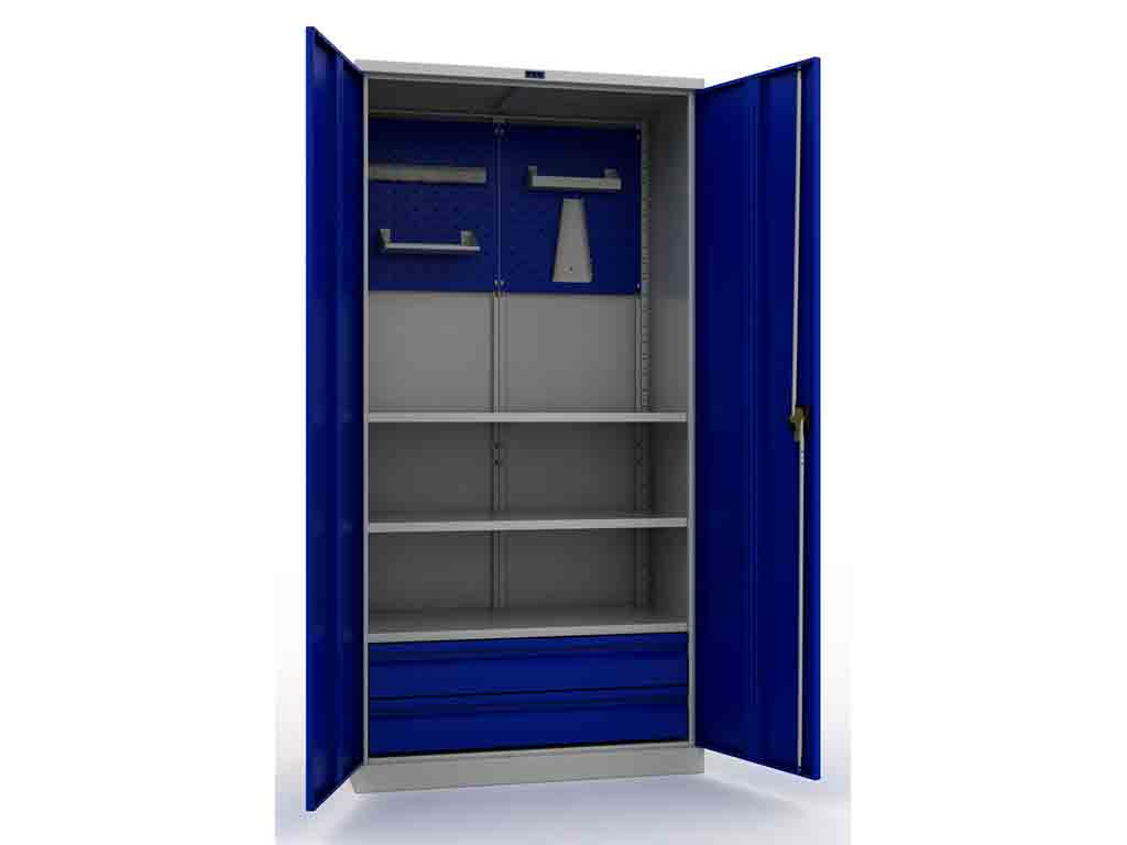 Шкаф инструментальный ПРОМЕТ ТС 1995-023020 с 3 большими полками, 2 выдвижными ящиками, малой полкой, экраном и держателями для ключей и инструментов